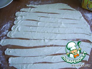 После холодильника часть теста раскатываем толщиной где-то 0,5 см и разрезаем на полоски шириной 3-4 см.
