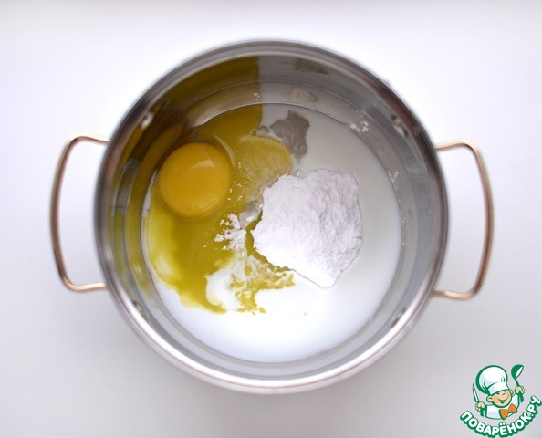 Желтки взбить с крахмалом, сахаром, ванилью, слегка подогретым молоком.