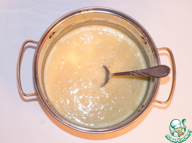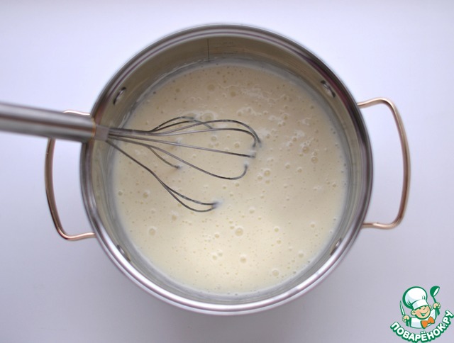 Варить на среднем огне до легкого загустения, все время мешая венчиком, иначе смесь может подгореть. Снять заварной крем с огня.