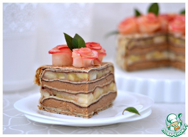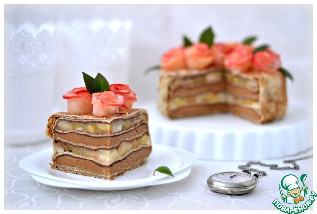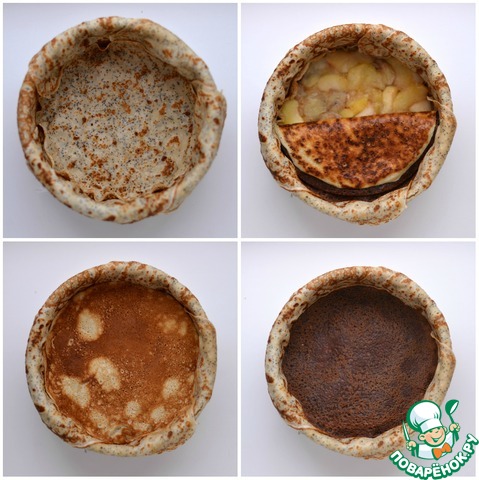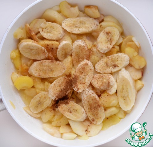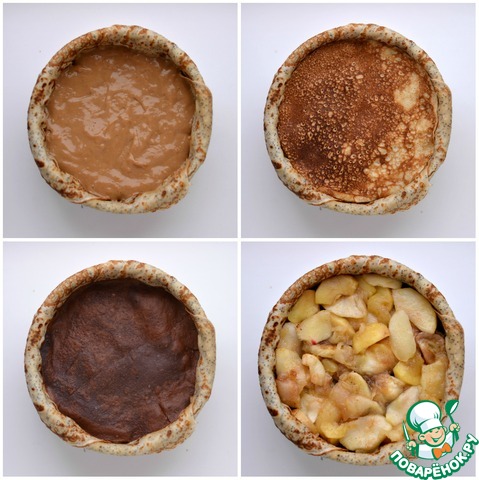 Выложить слой карамелизованных яблок и бананов. Накрыть маковым блином, затем шоколадным. Слегка прижать блины руками ко дну формы – утрамбовать.