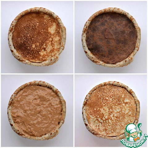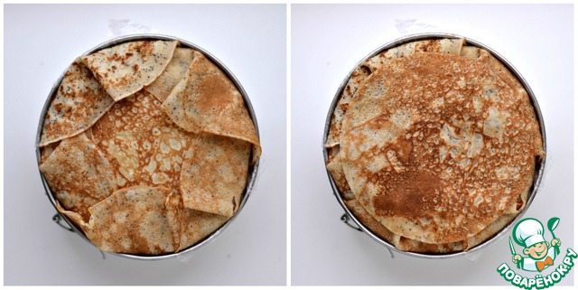 Форму диаметром 18 см выстелить пищевой пленкой. Укладываем в форму 4-5 обычных блинов так, чтобы их края немного свисали с бортика формы. Шоколадный блин обрезать по диаметру формы, уложить на дно.