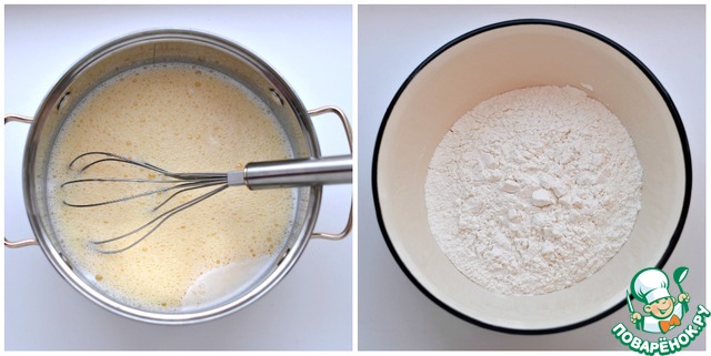 Соединить яйца, сахар, соль, соду, воду и 200 мл молока. Взбить венчиком до однородности. Всыпать частями 1,5 ст. просеянной муки, каждый раз взбивая венчиком, чтобы не было комочков.