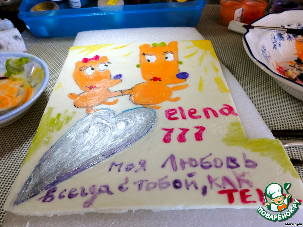 | Кулинарный ответ Елене777. У меня нет художественного образования, но так захотелось преподнести Леночке подарок. Видела торты-картины, разрисованные шоколадом, решила попробовать, вот что у меня получилось. |