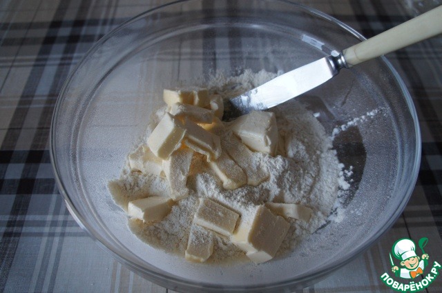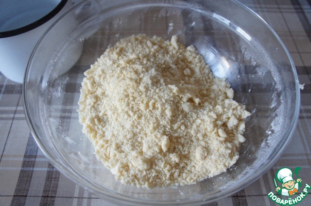 Муку и 150 г сливочного масла растереть руками в однородную крошку.