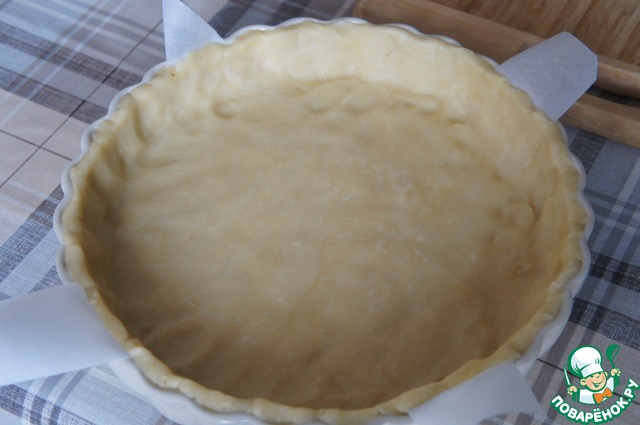 Форму d 24 см смазать маслом, тесто раскатать, выложить в форму и распределить по дну и бокам, оформив высокий бортик. Убрать в холодильник на 1 час.