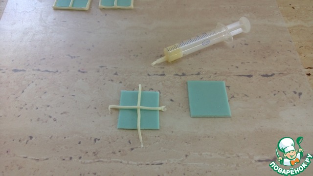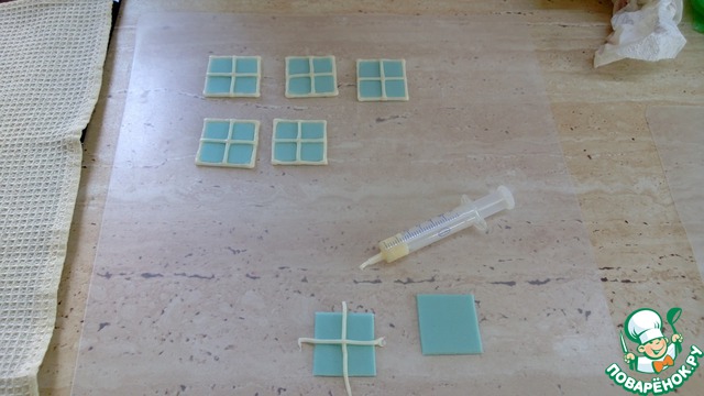 Делаем окошки для дома. В шприц помещаем кусочек мастики белого цвета и разогреваем либо в микроволновке, либо в кипятке.