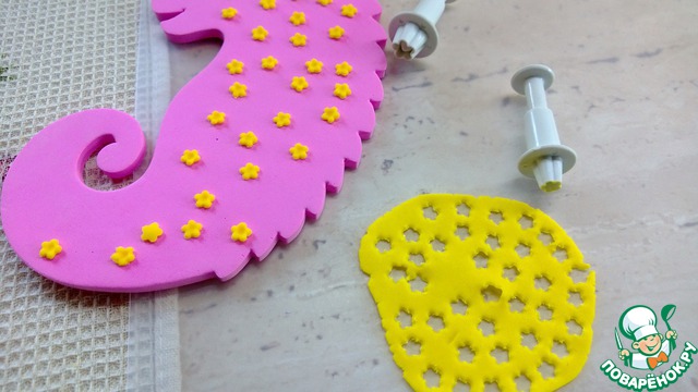 Достать из холодильника и еще раз размять до комнатной температуры. Работая с мастикой, посыпайте стол и руки крахмалом.