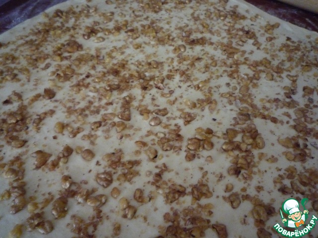 Измельченный грецкий орех перемешать с корицей и распределить равномерно по пласту теста.