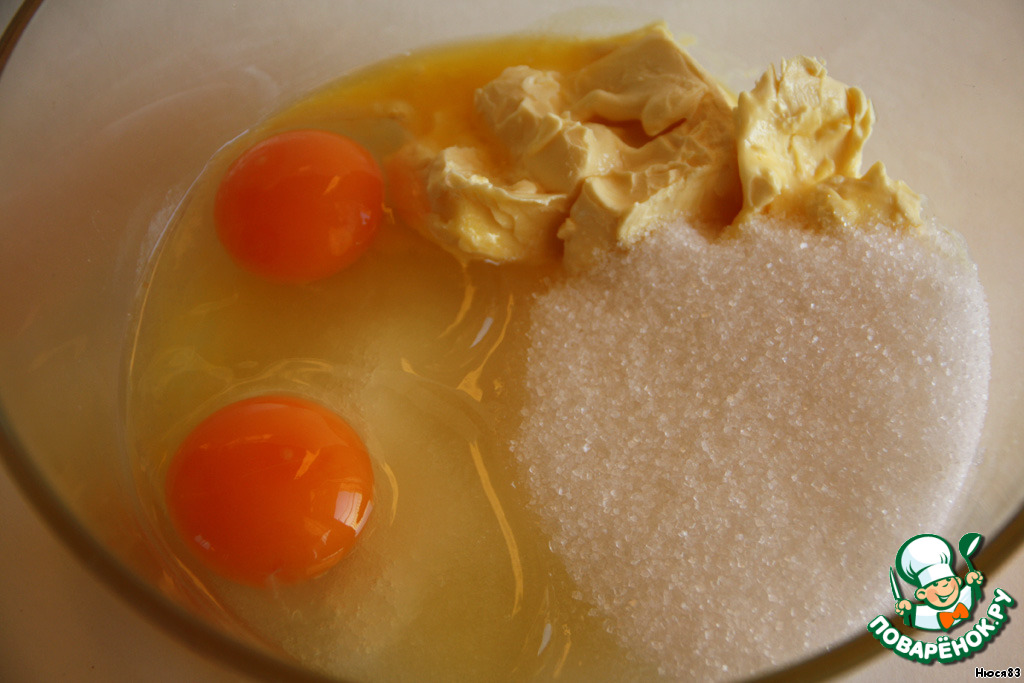 Яйца, размягченное сливочное масло и сахар взбиваем до однородности. Я делала это ложкой.