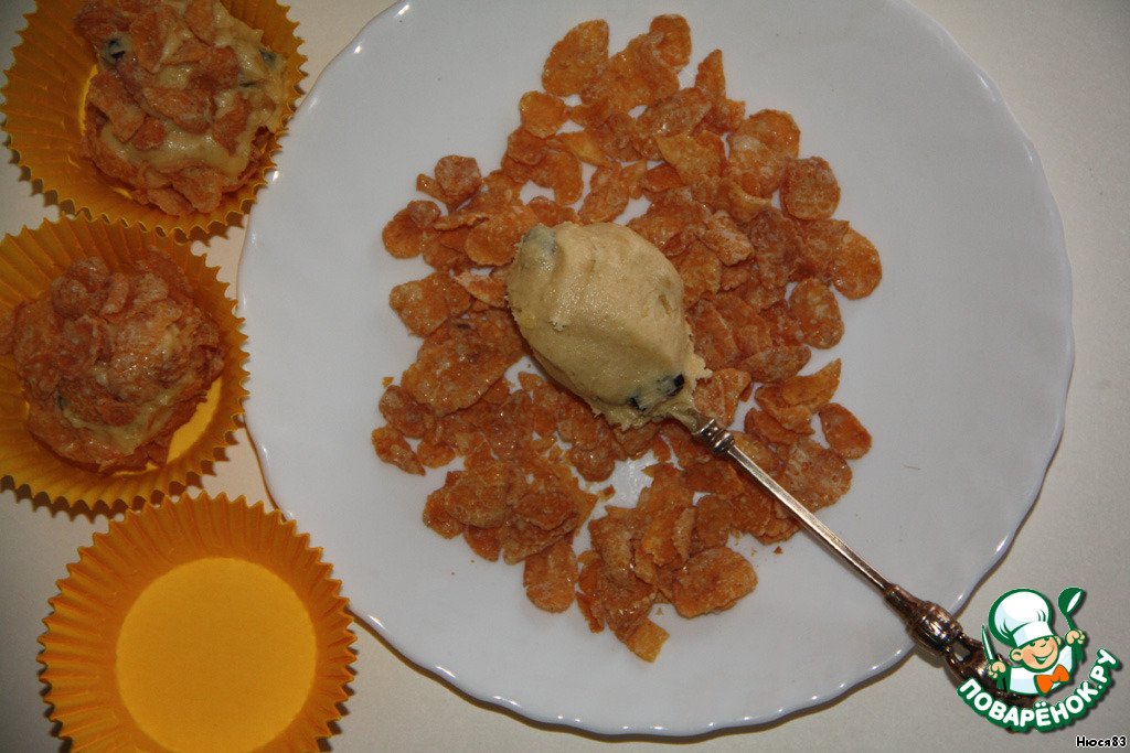 Выкладываем на тарелку с корн флейкс и присыпаем хлопьями. Пару штук я обваляла в миндальных лепестках.