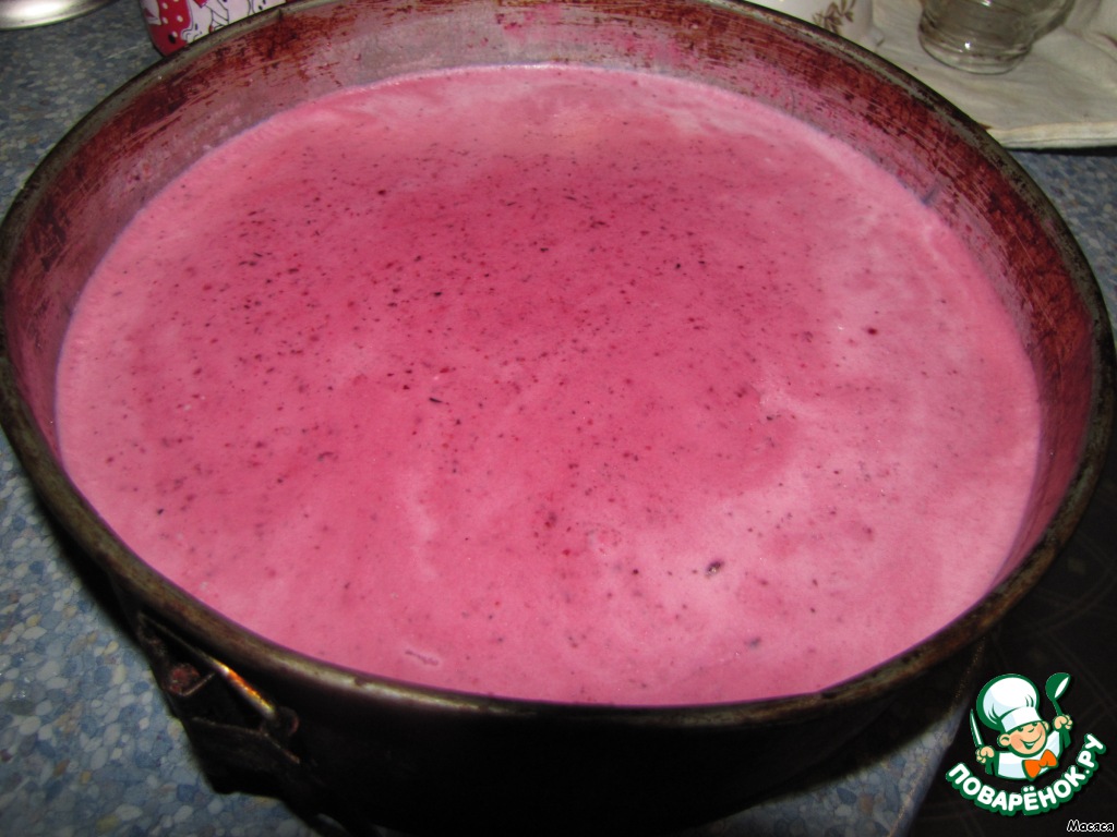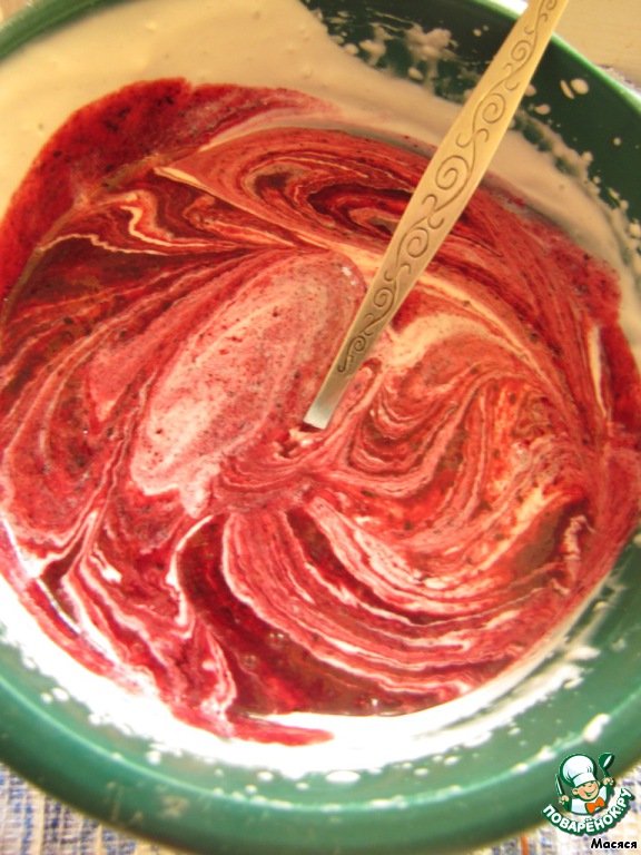 В первую половину добавляем ягодную массу и растопленный белый шоколад к сметане с творогом. Вот такой красивый цвет.