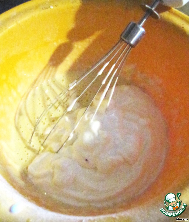 Добавляем к желткам муку, разрыхлитель. Перемешиваем. Затем аккуратно сверху вниз вмешиваем белки. Выливаем в смазанную маслом форму и отправляем в разогретую духовку на 30 минут.