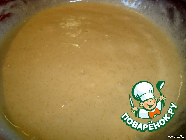 Смешиваем яйца, муку, молоко, сахар и разрыхлитель. Добавляем коньяк. Если тесто густовато, можно добавить пару ложек воды.