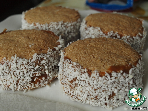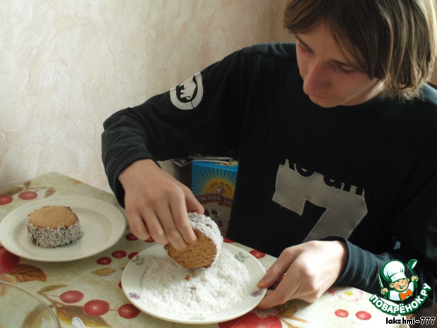 Далее берём по 2 кружка, намазываем варёной сгущёнкой и обмакиваем в кокосовую стружку. Эту работу я доверила своему сыну.