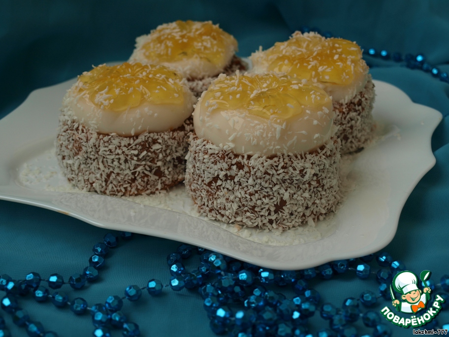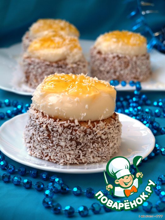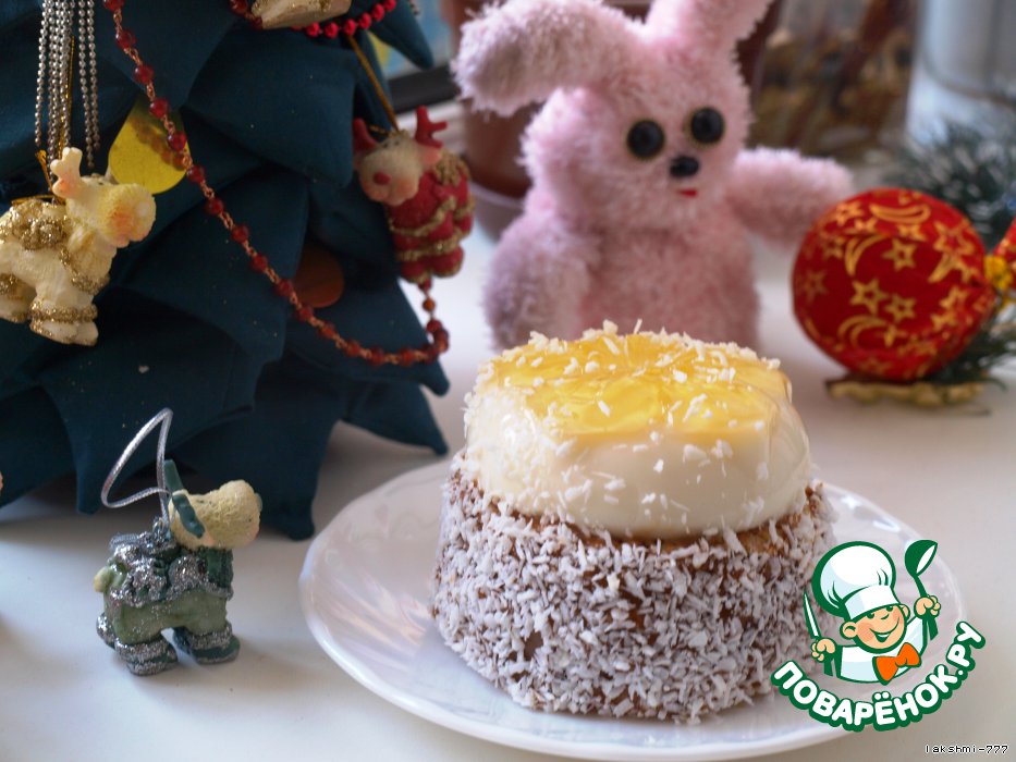 На смазанные сгущёнкой пирожные осторожно выкладываем из формочек желе и посыпаем кокосовой стружкой. Получаются "цветы под снегом".