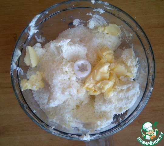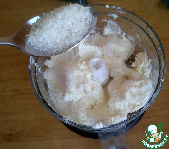 Складываем в блендер творог и кокосовую стружку. Творог нужен не жидкий.
