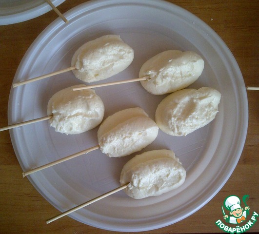Выдавливаем на одноразовые тарелки творожную массу как нам угодно. У меня получились такие овальчики)И втыкаем в них шпажки, что бы потом удобно было в глазурь макать. И в морозилку это всё до застывания (но не замораживать!)