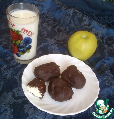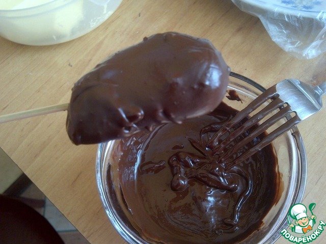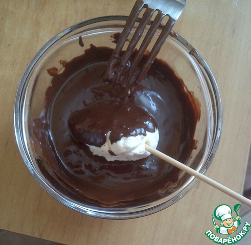 А теперь достаём из морозилки застывшие заготовки и макаем в шоколад. Но надо быстро это делать, потому что сырок так и норовит слезть со шпажки, потому как начинает подтаивать. Мне пришлось периодически ставить заготовки обратно в морозилку.