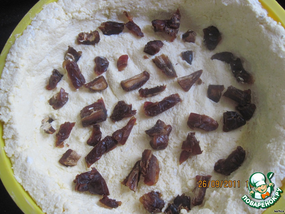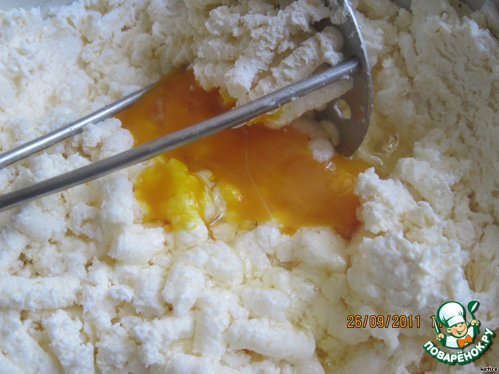 Творог перетереть с сахаром, если творог не жирный - добавить 50-70г сливочного масла.