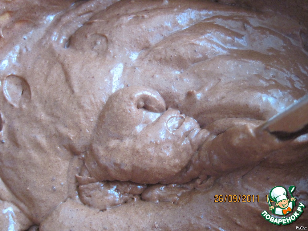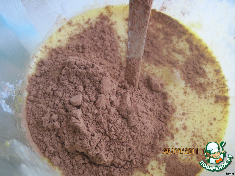3 яйца смешать с сахаром и сметаной, добавить какао, размешать.