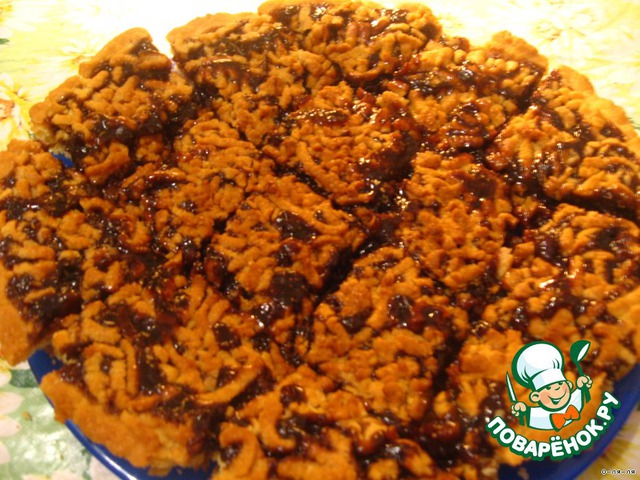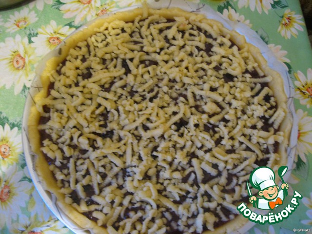 Пока мы всё это с вами делали, тесто в морозилке остыло. Берём его и трем на полученный пирог, на терке. Вот такой пирог у нас получился!!!