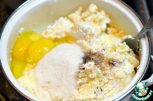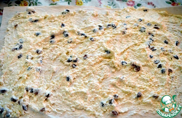 Творог при необходимости протереть через сито. Если творог мягкий, можно этого не делать. Добавить к творогу ванильный сахар, изюм и 2 яйца. Хорошо перемешать.