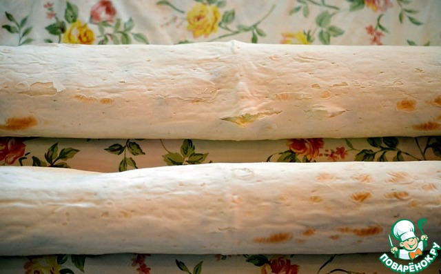 На лаваш намазываем начинку. У меня начинки хватило на 2 лаваша.