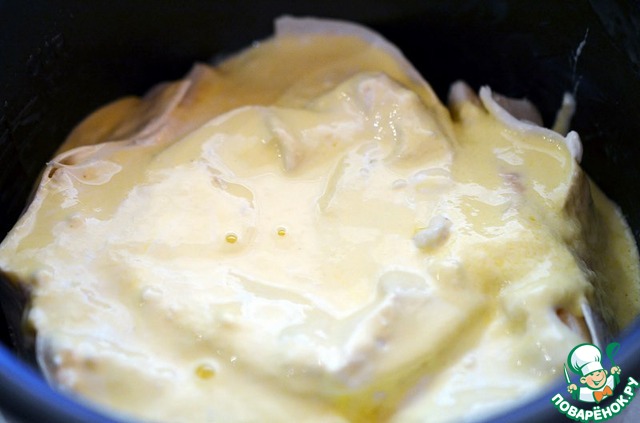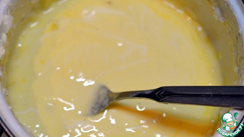 Для заливки смешиваем сметану и оставшиеся яйца, взбиваем вилкой.