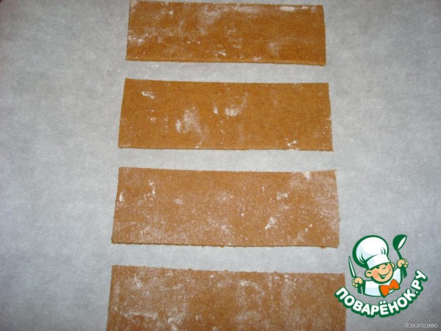 Порцию теста раскатать в пласт 0,5см. и вырезать 4-ре печенюхи 6х17, затем одну 17х17 и ещё одну 16х16.