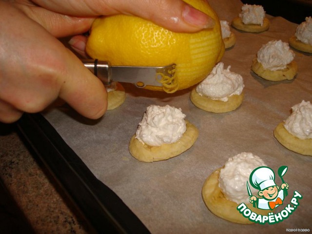 по ложечке начинки,сверху каждой печенюшки положить завитушки из лимонной цедры