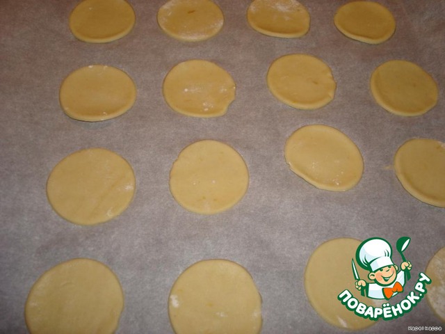 Из теста раскатать тонкий пласт,вырезать стаканчиком кружки,выложить на протвень