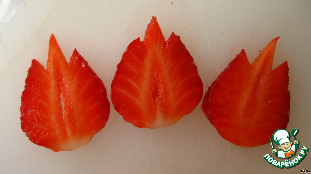 В это время чистим и моем клубнику, нарезаем кубиками (оставляем 3 пластинки для украшения) и раскладываем по стаканчикам (вкуснее, когда в широкой форме, так как вся клубника будет покрыта шоколадной массой. В данный момент у меня такой нет).
