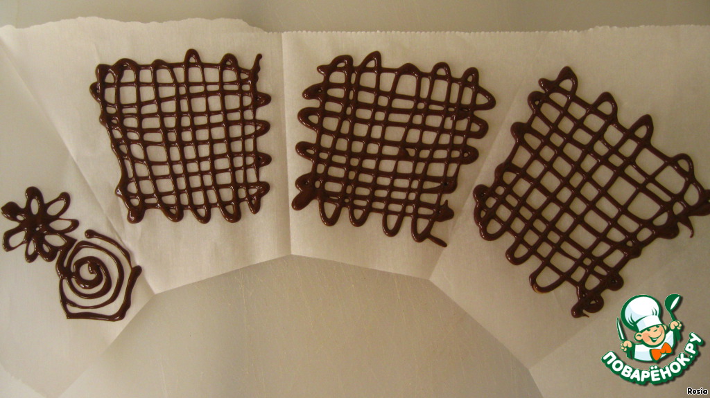 Наполняем его 2-3 чайными ложками шоколада и на пергаменте выдавливаем сеточку. Ставим в морозилку.
