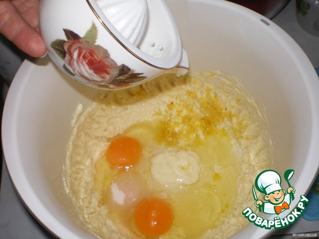 Добавить яйца, ванильный сахар, цедру и сок лимона.