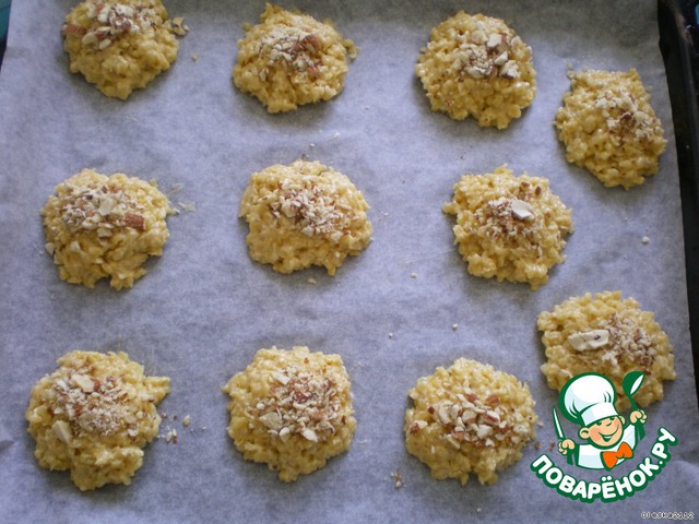 Теперь формуем печенье чайной ложечкой на противне, застеленном бумагой для выпечки. Сверху посыпаем орехом.
