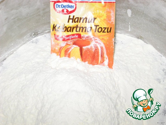Муку просеиваем вместе с разрыхлителем. Добавляем в тесто. Тщательно перемешиваем.