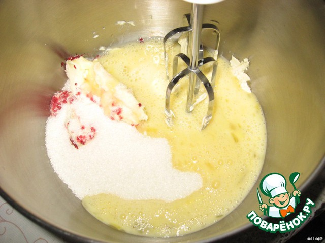 Размятый маргарин взбиваем с сахаром, добавляем слегка взбитые яйца, перемешиваем до однородности.