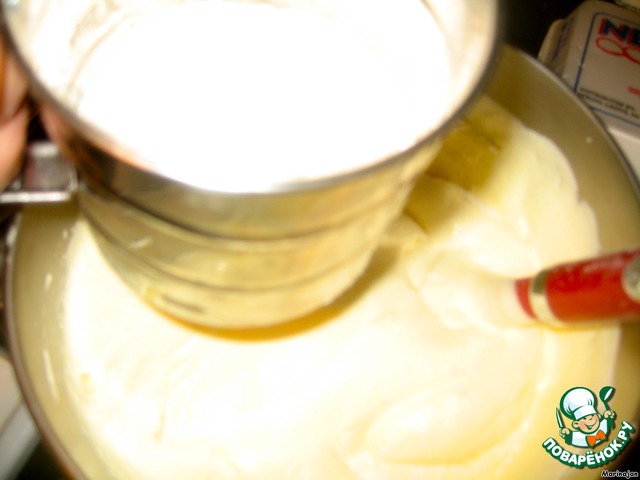 Белки взбить до густых пиков, постепенно добавляя сахар, а потом по-одному добавляем желтки. Миксер выключаем и просеиваем муку, осторожно помешивая лопаткой.