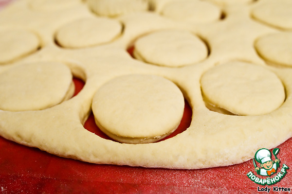 Раскатать тесто в пласт толщиной примерно 1,5 см и при помощи стакана вырезать круги. У меня получилось 26 штук диаметром 5 см.