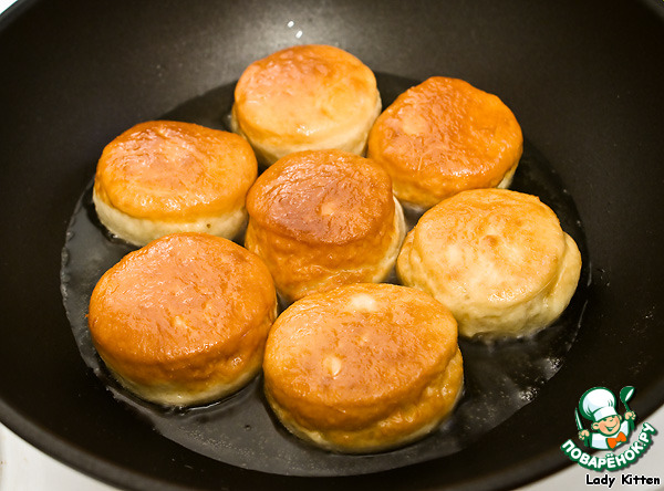 В большую сковороду налить растительное масло и обжарить пончики с двух сторон до золотистого цвета.