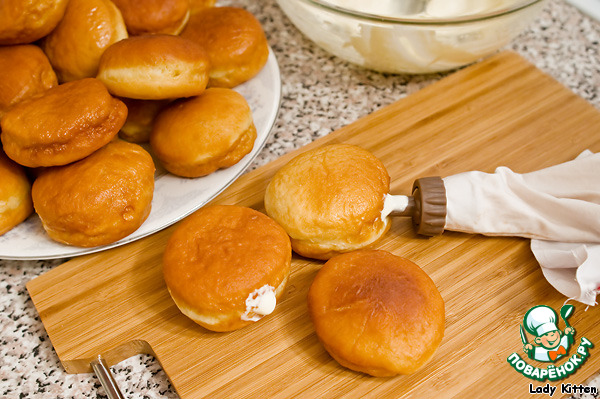 С помощью кондитерского шприца наполнить каждый пончик начинкой.