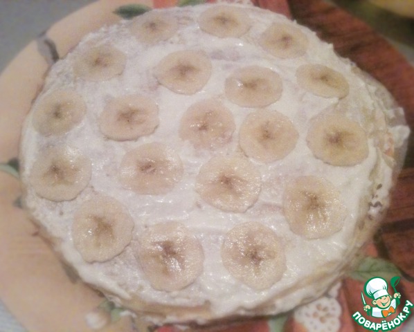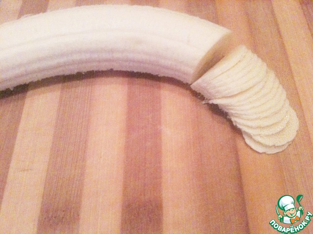 Банан нужно нарезать очень-очень тонко. В противном случае торт будет просто-напросто разваливаться при нарезании. Так что постарайтесь)