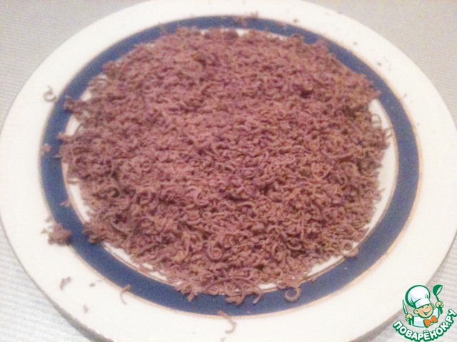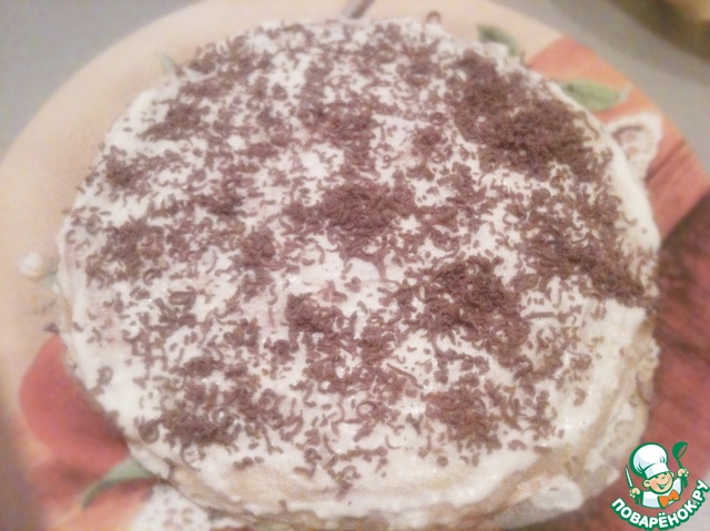 Следующий блин. Снова его смазываем кремом и посыпаем тертым шоколадом.