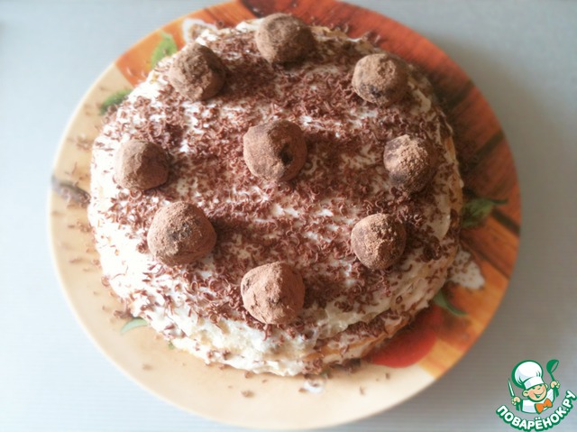 Пока наш собранный торт стоит в холодильнике и пропитывается, можно подумать над его украшением) Я решила сделать трюфель, поскольку очень его люблю, да и в сочетании с бананом будет великолепно)