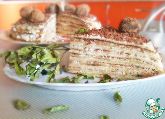 Теперь достаем наш чудесный блинный тортик из холодильника, украшаем трюфелем и…наслаждаемся!)