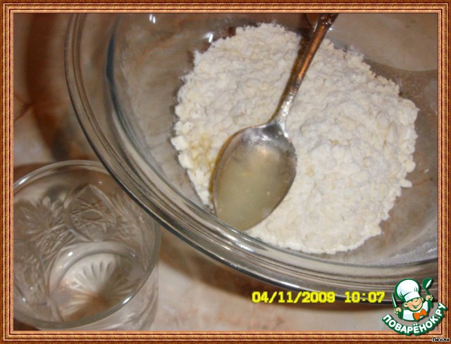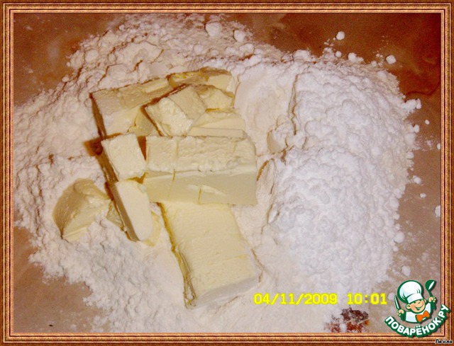 Просеять муку (1 1/4 стак.) с солью и (2 ст. л.) сахарной пудрой.
