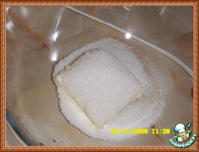 Взбить масло (113 гр, комнатной температуры) с сахаром (1/4 стак).