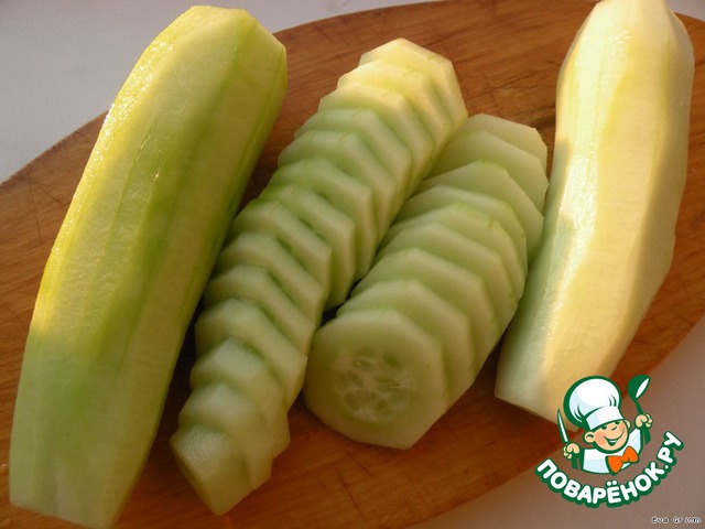 Огурцы очистить от кожуры и нарезать кружочками... Ну или кубиками ;-) , как вам больше нравится...
