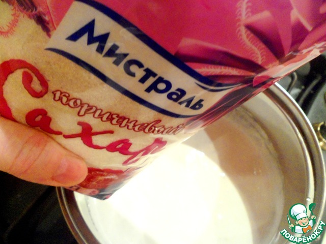 Взбить белок с 100г мелкого коричневого сахара фирмы «Мистраль», добавить туда 150г молока, 1ст. л. муки и 1 пакетик ванили и, помешивая, варить до загустения. Остужаем и соединяем с 150г взбитых сливок, аккуратно перемешивая лопаткой.