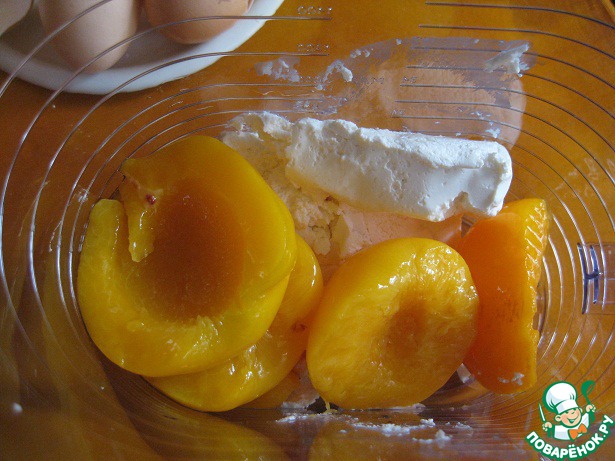 Ровно половину персиков откладываем в чашу, добавляем творог и взбиваем блендером.